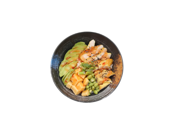 зелени салати, чери домати, манго, яйце, ананас, киноа, скариди, дресинг
