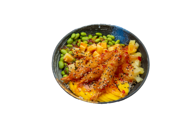 скариди, авокадо, сусам, сусамово олио, едамаме , дракон сос , ориз, манго