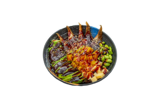скариди, авокадо, сусам, сусамово олио, едамаме , дракон сос , ориз, манго