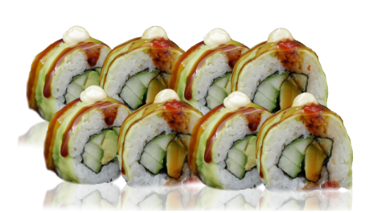 4 pcs. - 140 gr. rice, nori, smoked salmon, cucumber, avocado, yakata mayonnaise, dragon sauce, unagi sauce
