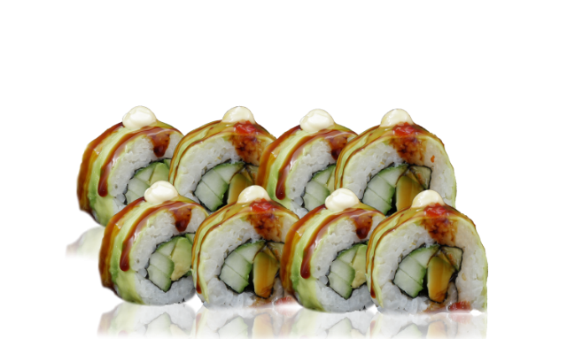 8 pcs. -280 gr. rice, nori, smoked salmon, cucumber, avocado, Philadelphia, yakata mayonnaise, dragon sauce, unagi sauce